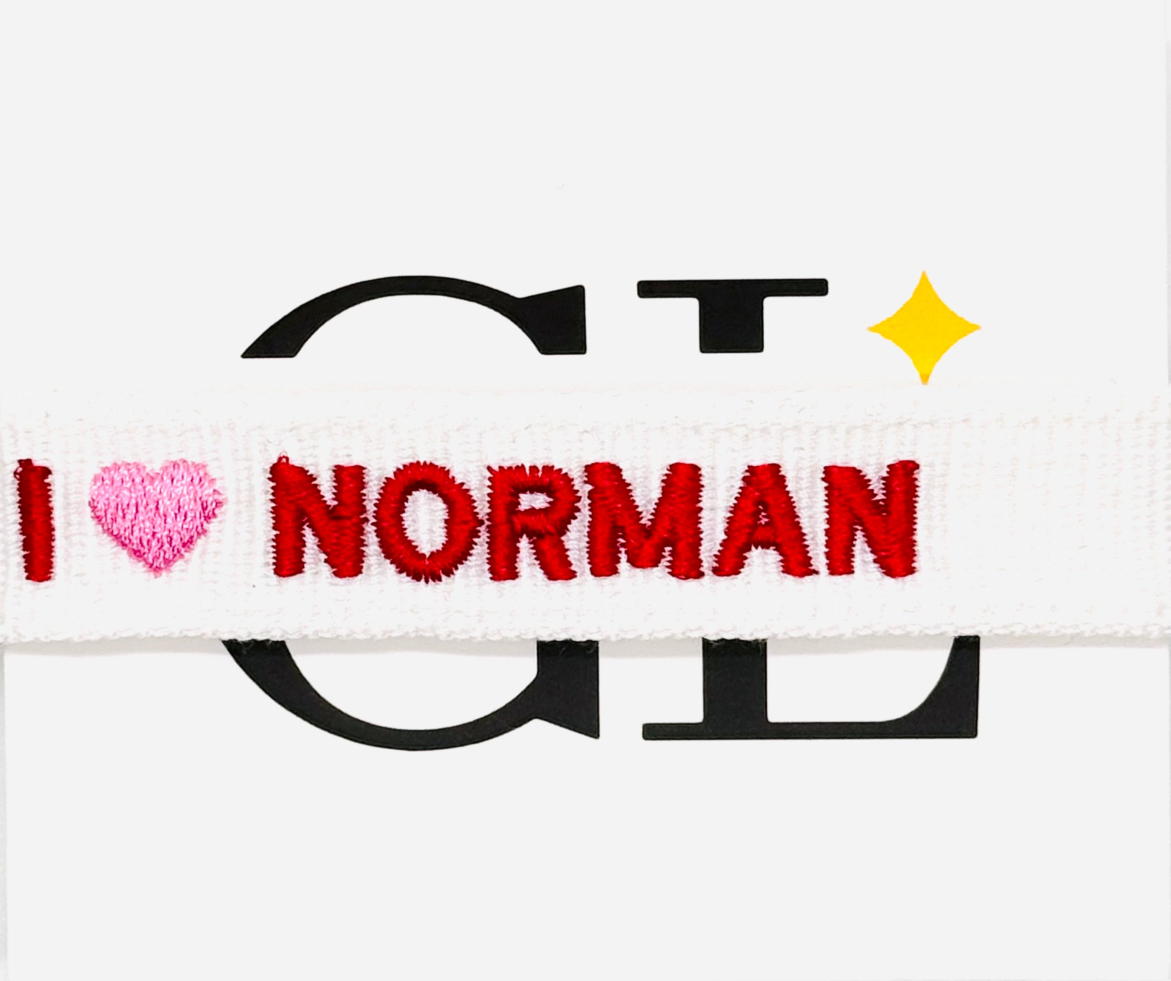 One size fits all white cotton / poly bracelet. I heart Norman hand embroidered in crimson and pink thread. Bracelet self ties.