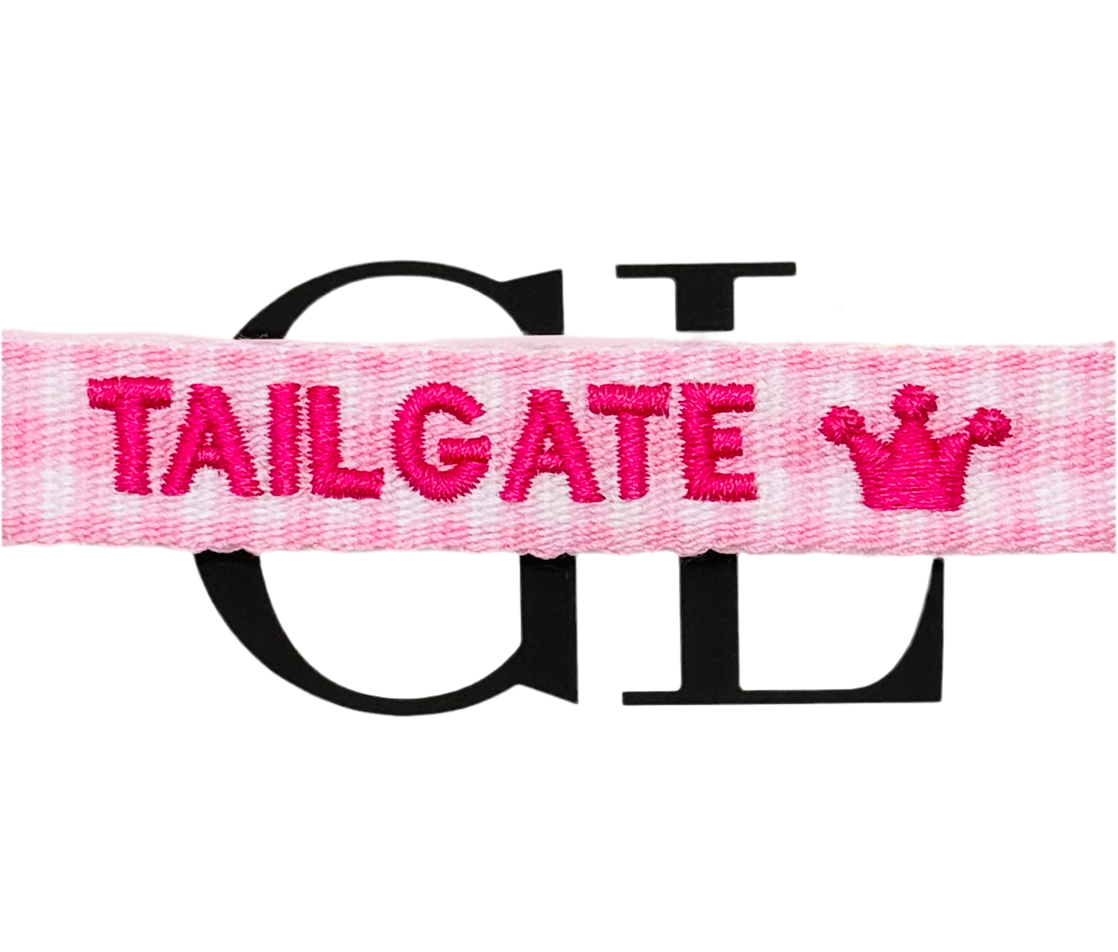 Pink and white gingham pattern with hot pink embroidered tailgate with crown symbol. One size fits all. Self tie.