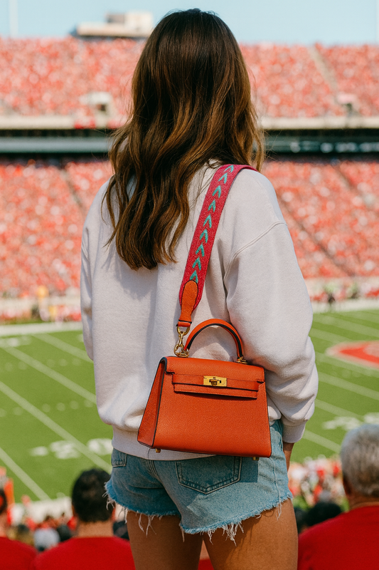 Add a pop of color to your look with the Jana bag. Made from Italian leather with rich gold hardware, this bag makes a statement. The Jana bag comes with both a leather and canvas strap in complimentary colors. Interior card slot. Not stadium compliant for all venues. 7x5x2. *will fit standard phone. Not an i phone pro.