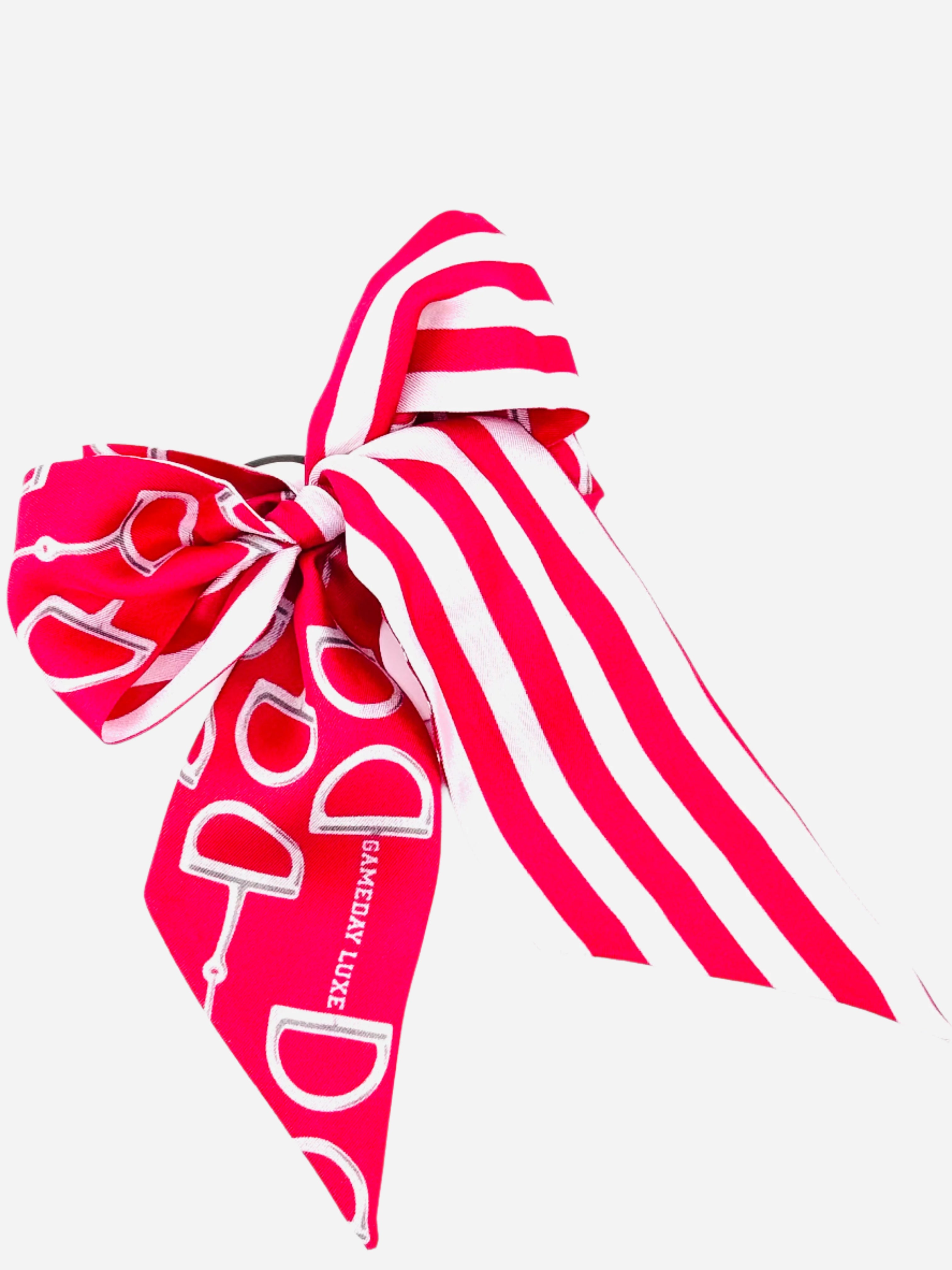 Add a little something extra to your Clear bag with one of our Signature Gameday Scarves. Made of 100% silk, this custom fabric twilly is sure to elevate your gameday look. One side is printed with an iconic horsebit print while the opposite side has a complimentary classic stripe print. Tie it around the handle of your bag, wear it in your hair, or tie it onto your boots! 32 Inches x 2 Inches