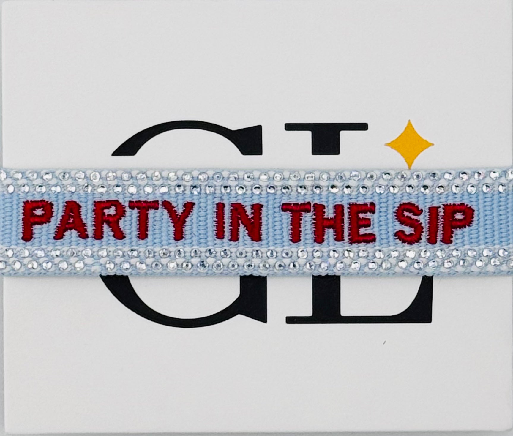 Our signature Team Tassel bracelet with a little something extra. Welcome the Party In the Sip Bling Tassel to the fam. Light blue cotton/ poly blend self tie bracelet. Party in the Sip in red font, lined with clear rhinestone edge.