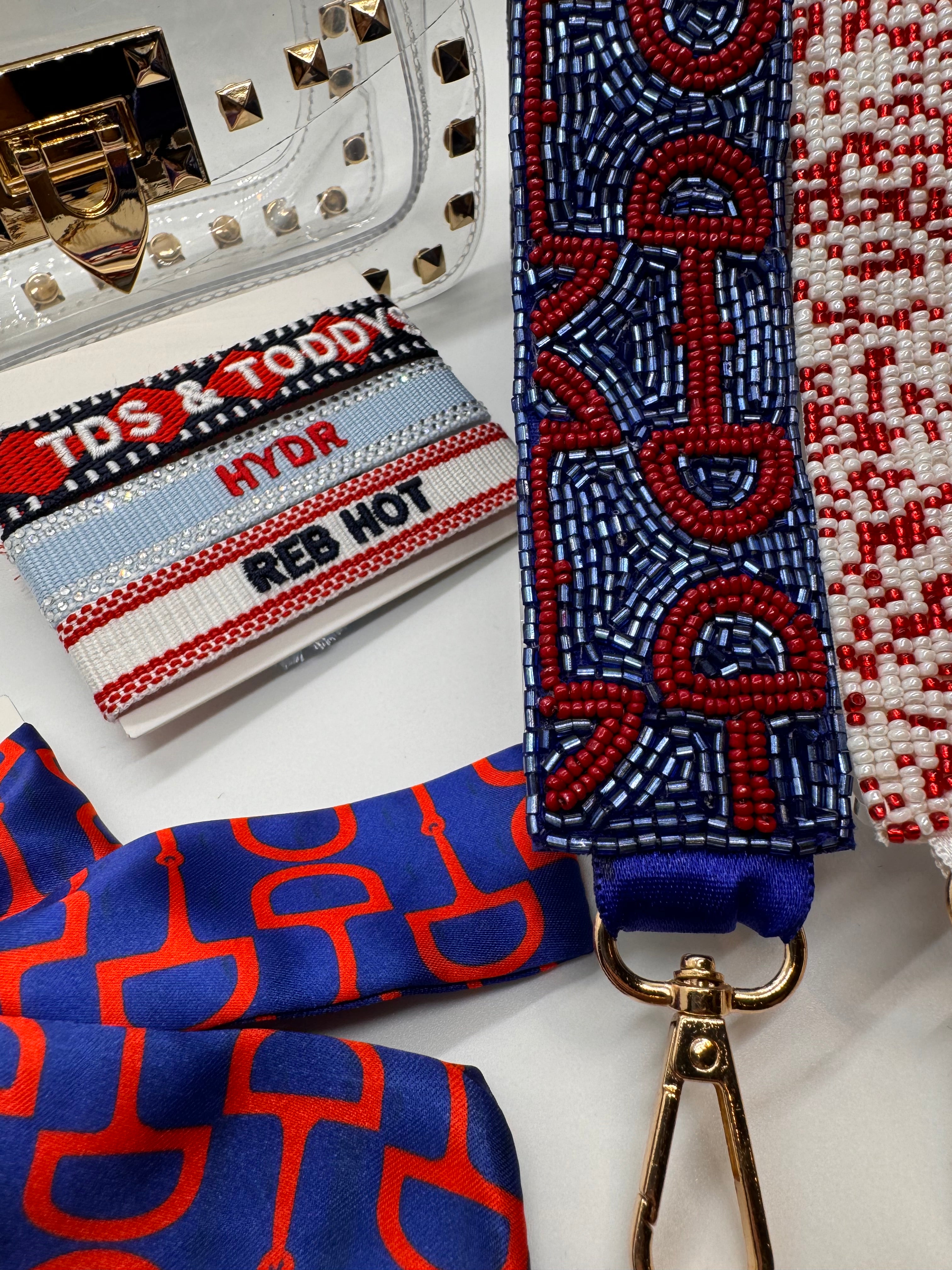 Designed with Ole Miss fans in mind. The Touchdowns and Toddys bracelet is made from a cotton poly blend. It boasts a festive navy, red, and white pattern perfect for a tailgate at the Grove. One size fits all. Self tie.