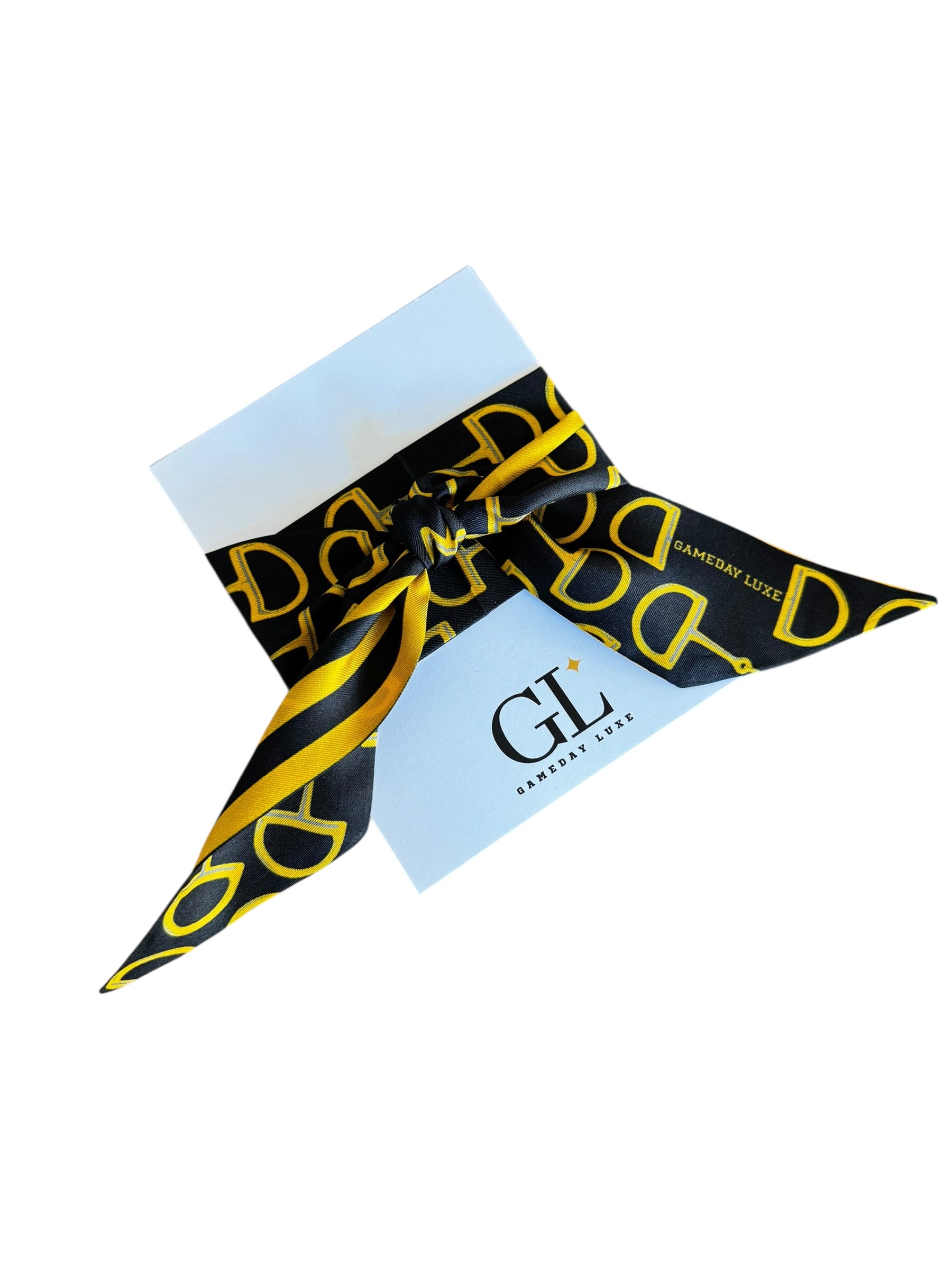 Add a little something extra to your Clear bag with one of our Signature Gameday Scarves. Made of 100% silk, this custom fabric twilly is sure to elevate your gameday look. One side is printed with an iconic horsebit print while the opposite side has a complimentary classic stripe print. Tie it around the handle of your bag, wear it in your hair, or tie it onto your boots! 32 Inches x 2 Inches