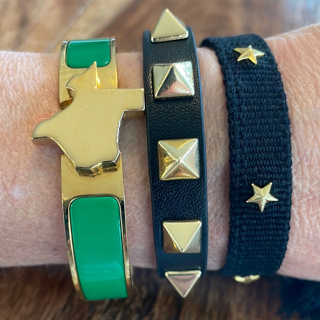 The perfect stacking piece. Adjustable leather band fits wrists 7-9 inches. Gold plated pyramid rivet stud