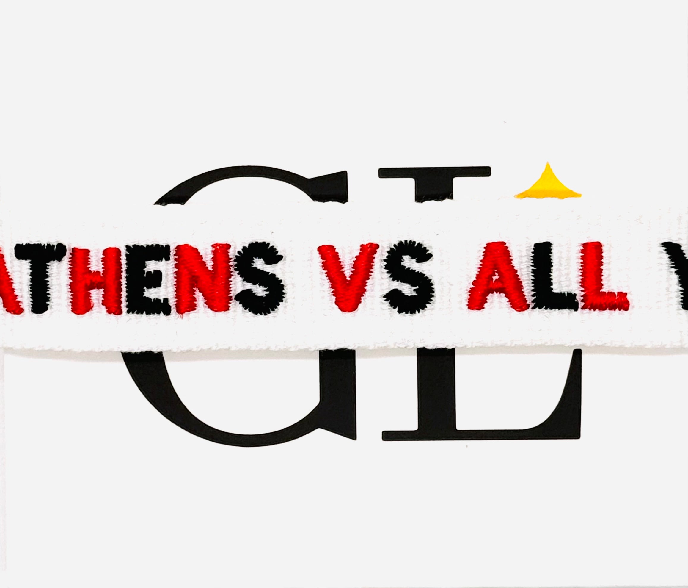 One size fits all white cotton/ poly bracelet with Athens vs All Y'all in alternating red and black font. Bracelet self ties.