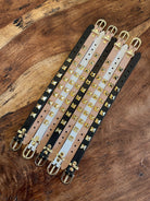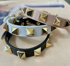 The perfect stacking piece. Adjustable leather band fits wrists 7-9 inches. Gold plated pyramid rivet stud
