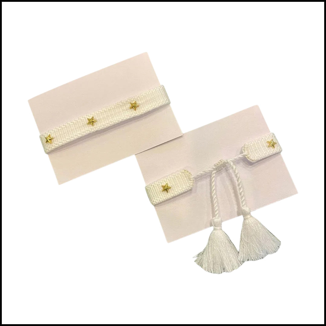 One size fits all friendship bracelet with gold stars. Available in White, Black, Kelly Green, Royal Blue, and Orange