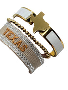 Our signature Team Tassel bracelet with a little something extra. Welcome the Texas Bling Tassel to the fam. Tan self tie bracelet. Texas in burnt orange font, lined with a clear rhinestone edge.