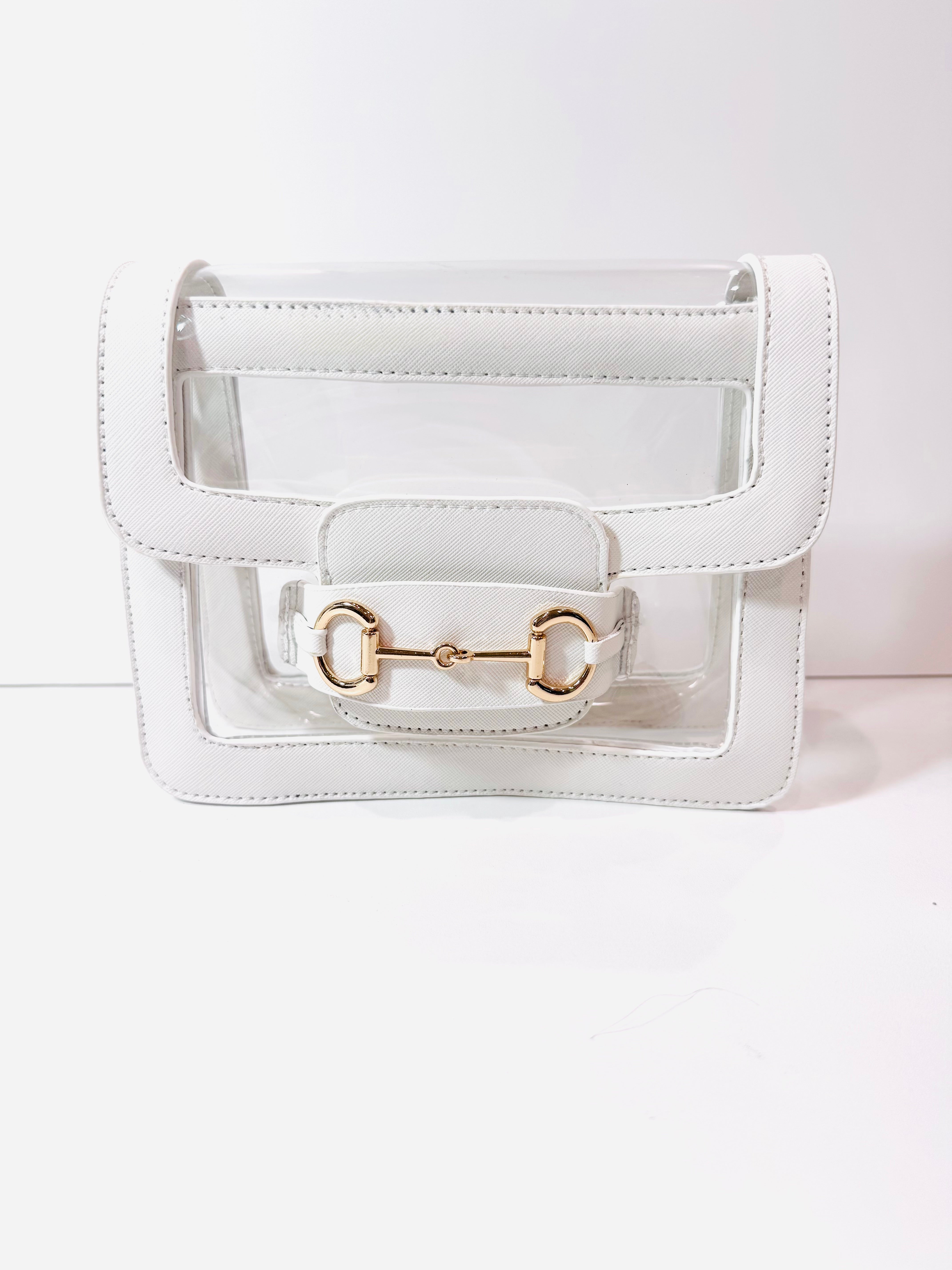 Our refined take on the classic, clear, cross-body bag. Designed with a signature equestrian- inspired gold plated horse bit detail, this bag blends luxury styling with stadium compliance.