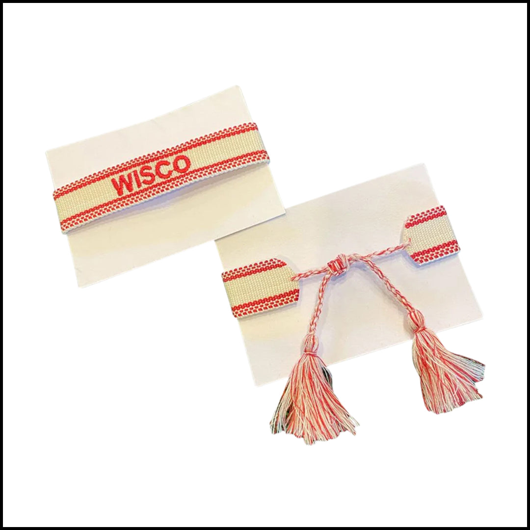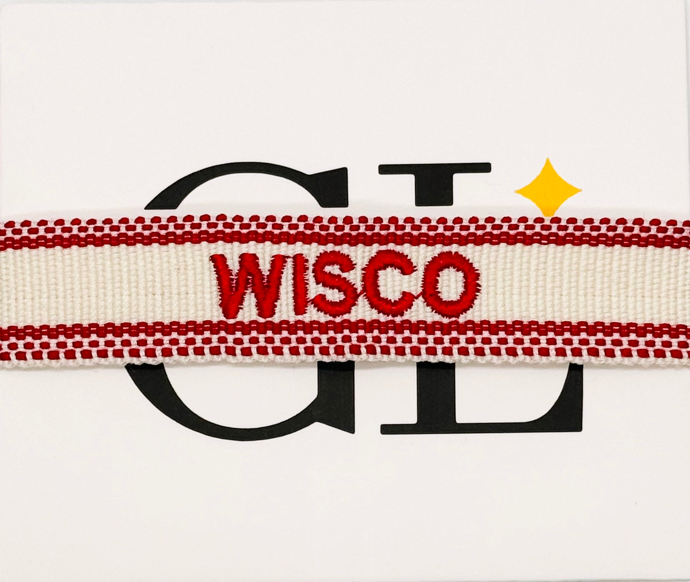 One size fits all creme cotton/ poly bracelet with red trim. Wisco embroidered in red thread. Bracelet self ties.