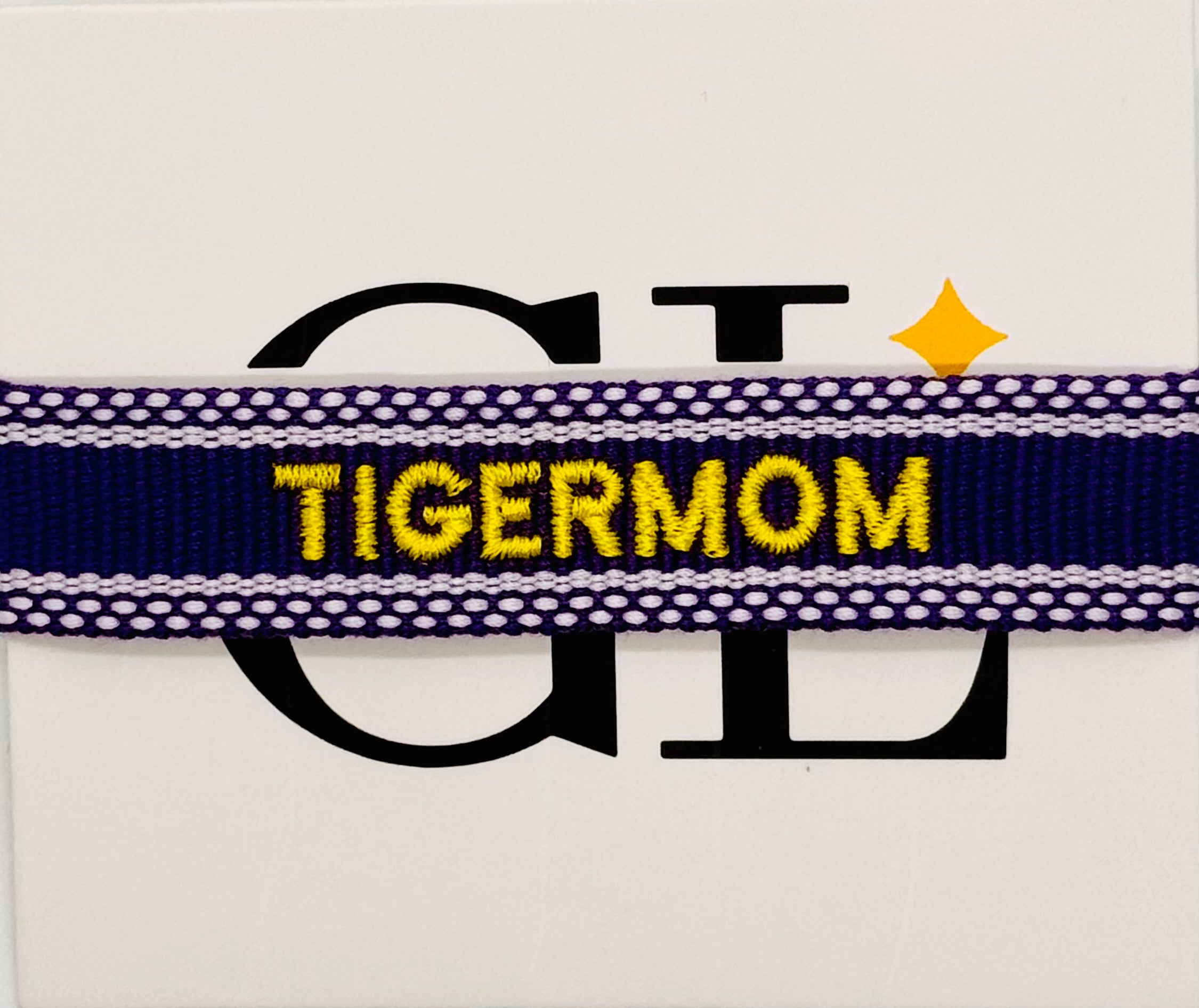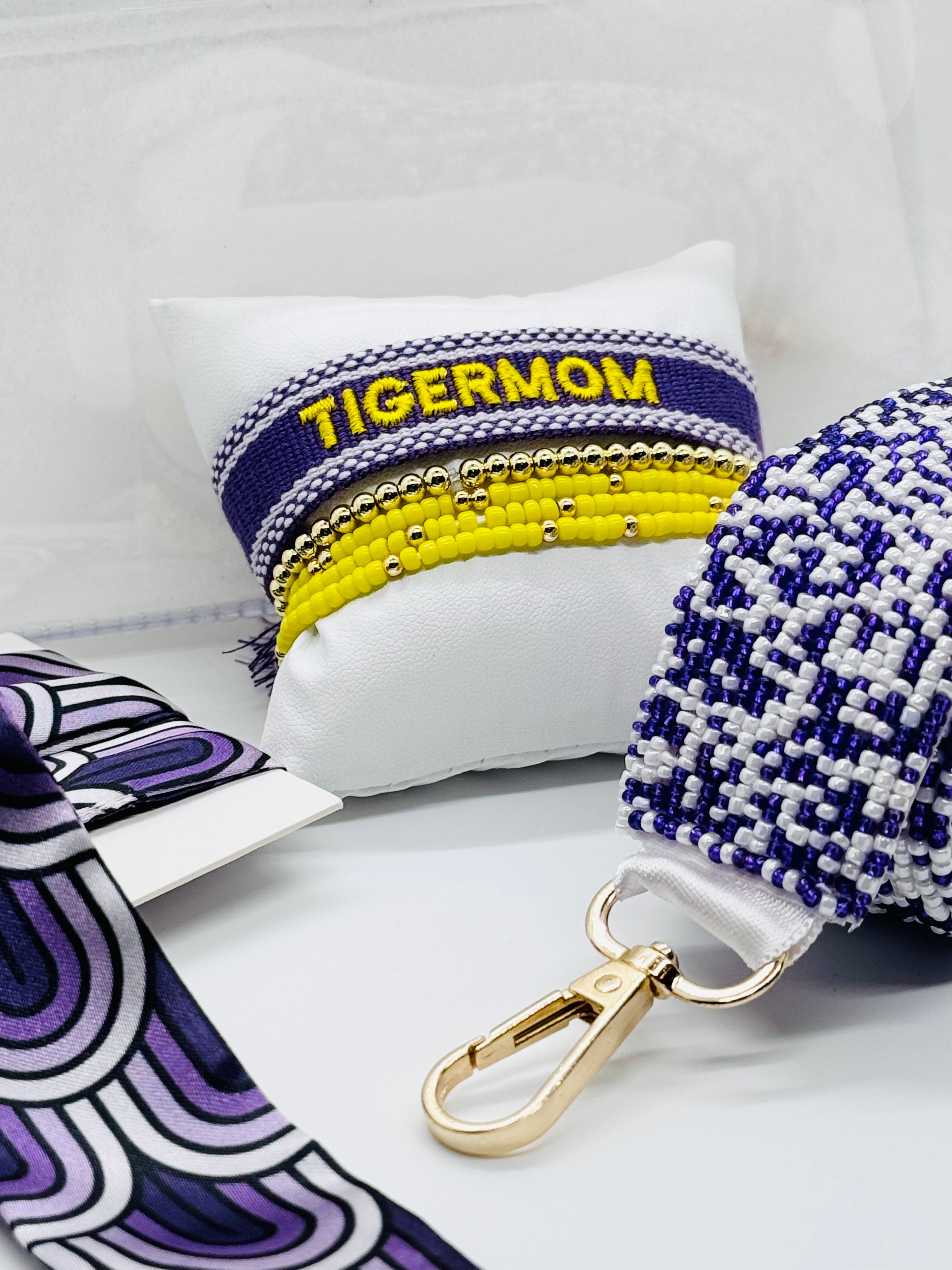 Tigermom? or mom of a Tiger? Show your love for all things LSU with this Tassel. Wear it solo or stacked, one size fits all . This purple cotton / poly bracelet with white trim features Tigermom embroidered in yellow gold thread. Bracelet self ties.