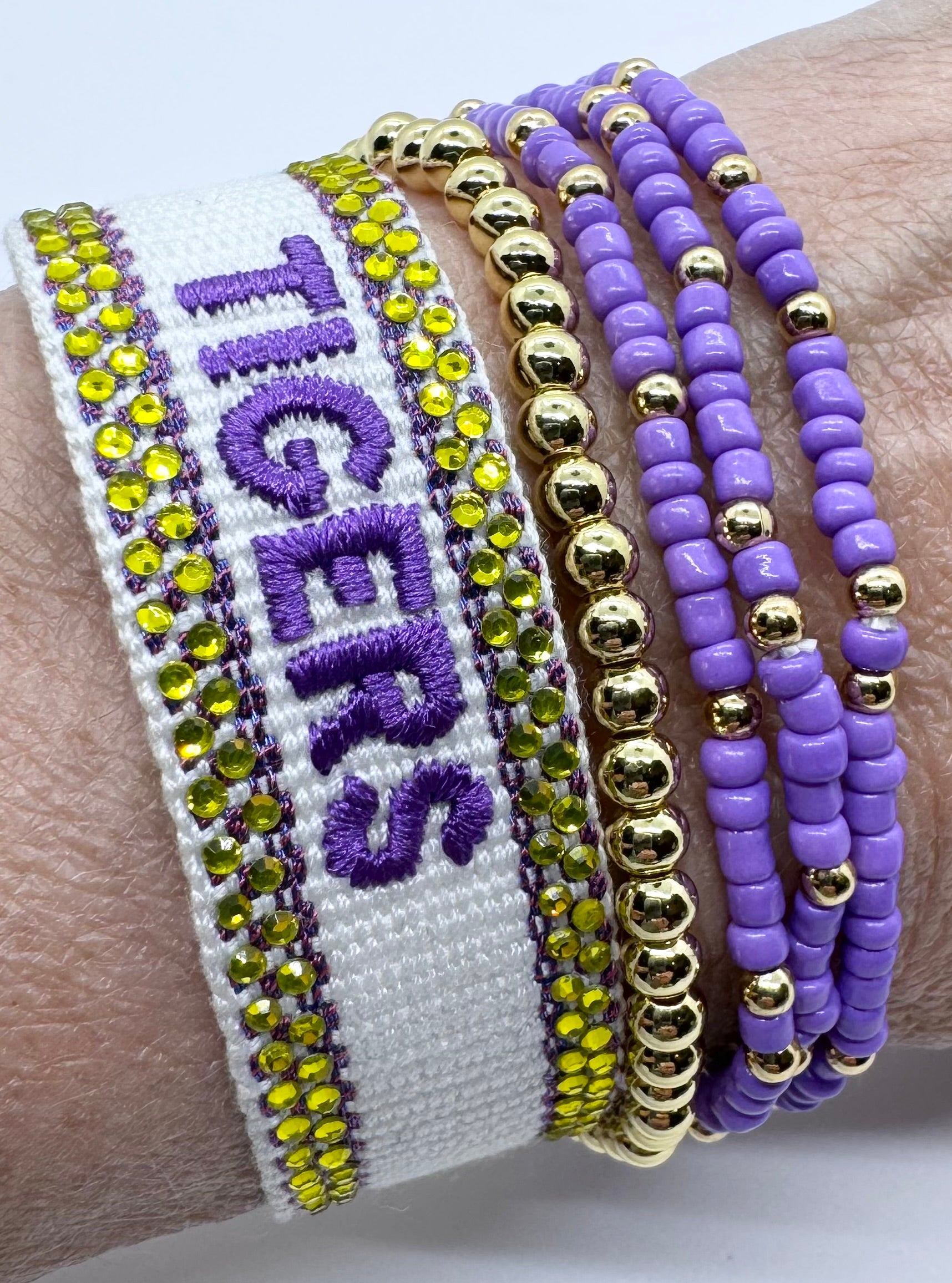 Our signature Team Tassel bracelet with a little something extra. Welcome the Tigers Bling Tassel to the fam. white cotton/ poly blend self tie bracelet. Tigers in purple font, lined with yellow rhinestone edge.
