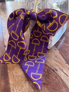 Add a little something extra to your Clear bag with one of our Gameday Scarves. Made of 100% silk, this custom fabric twilly is sure to elevate your gameday look. One side is printed with an iconic horsebit print while the opposite side has a complimentary classic stripe print. Tie it around the handle of your bag, wear it in your hair, or tie it onto your boots! 32 Inches x 2 Inches