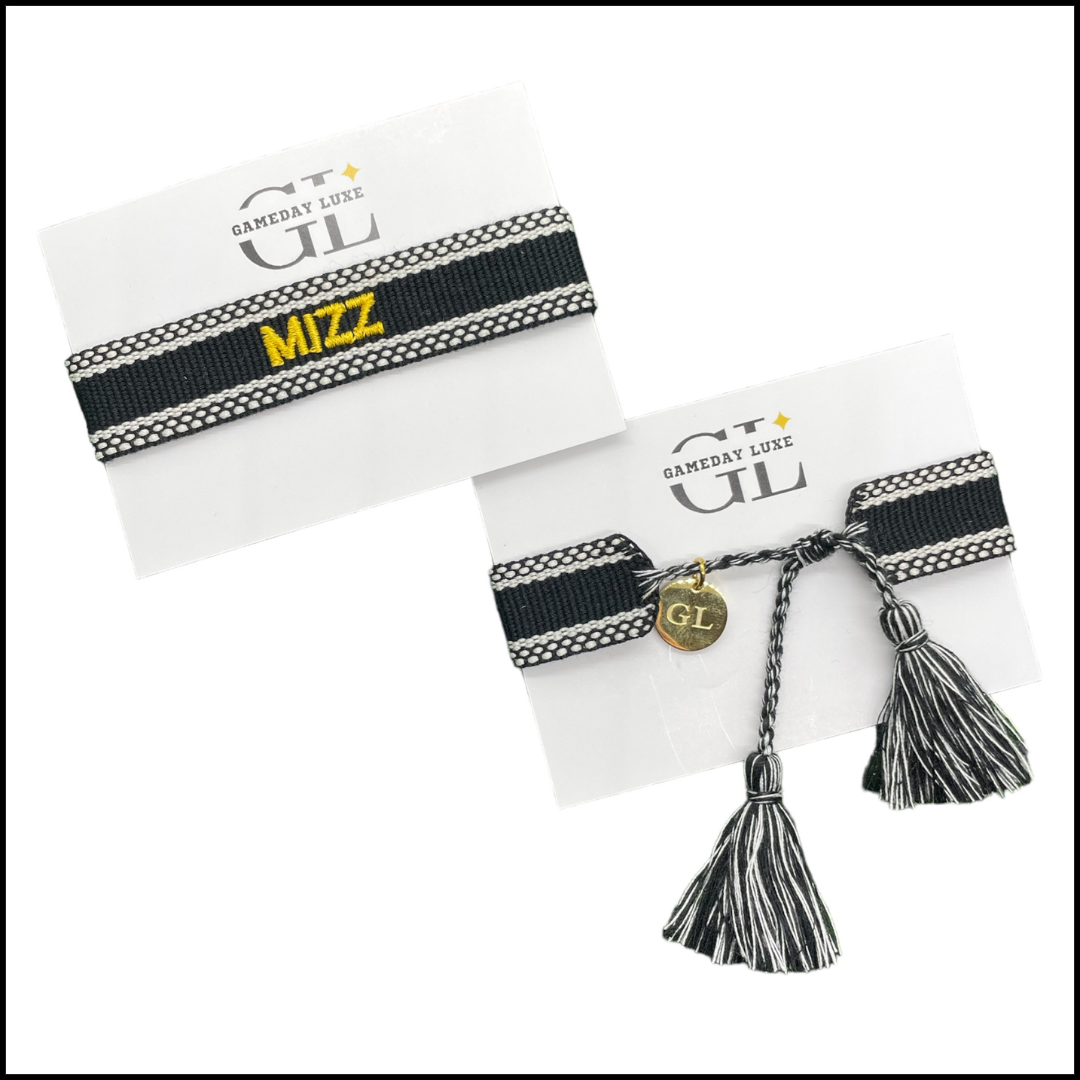 The wait is over and the MIZZ bracelet is here. One size fits all black cotton/ poly bracelet with white trim. Gold MIZZ embroidered onto the bracelet. Bracelet self ties.