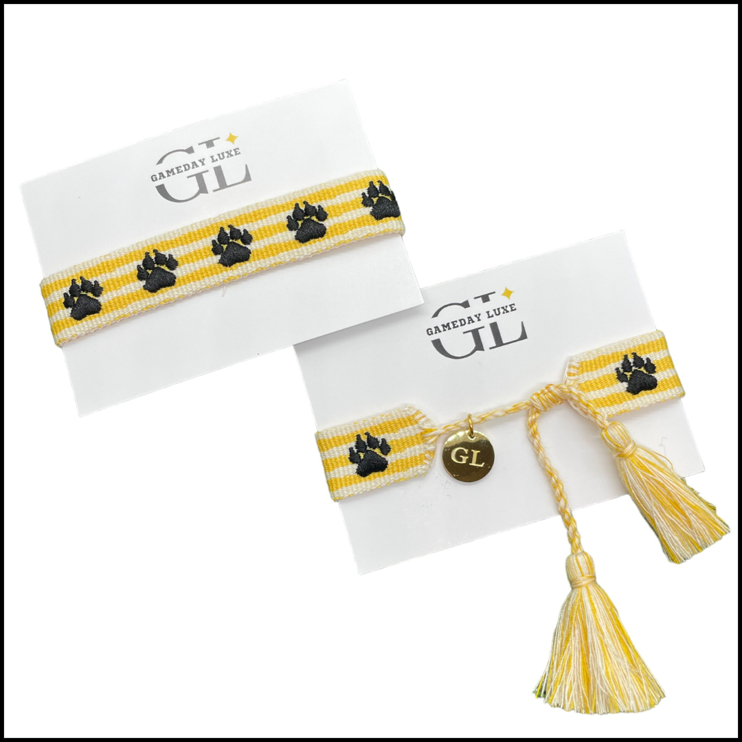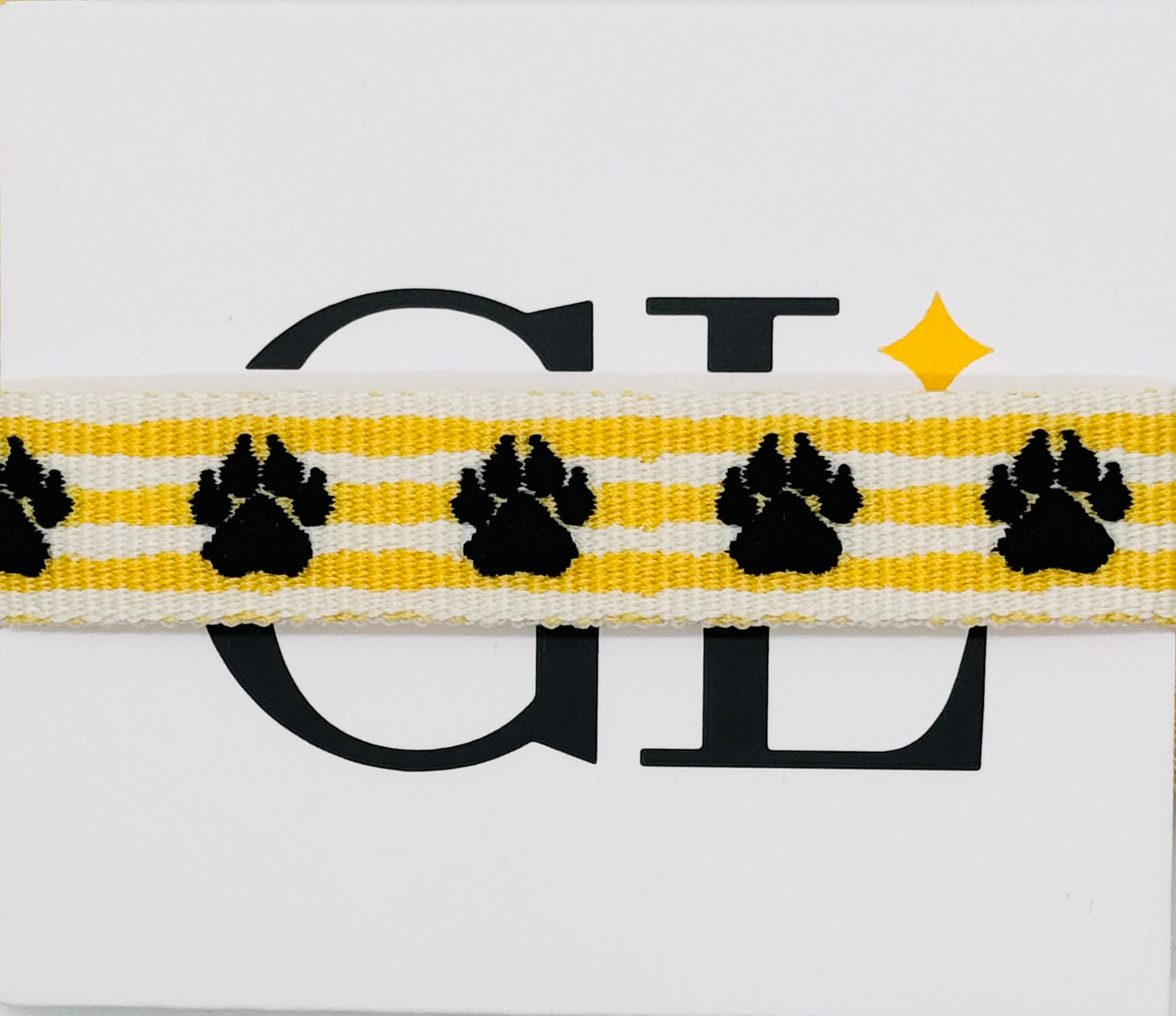 Do you root for Tigers? One size fits all Yellow gold striped cotton/ poly bracelet. Black paw prints embroidered onto the bracelet. Bracelet self ties.