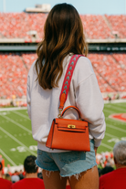 Add a pop of color to your look with the Jana bag. Made from Italian leather with rich gold hardware, this bag makes a statement. The Jana bag comes with both a leather and canvas strap in complimentary colors. Interior card slot. Not stadium compliant for all venues. 7x5x2. *will fit standard phone. Not an iphone pro.