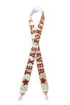 Love the Longhorns or the state of Texas? Dress up your clearbag fit with our hand beaded Texas Forever strap. This style is exclusive to Gameday Luxe and features a white glass bead, hand beaded in a confetti pattern with Orange letters and Stars. This strap is 1.5 inches wide and 48 inches fully extended. Gold hardware.