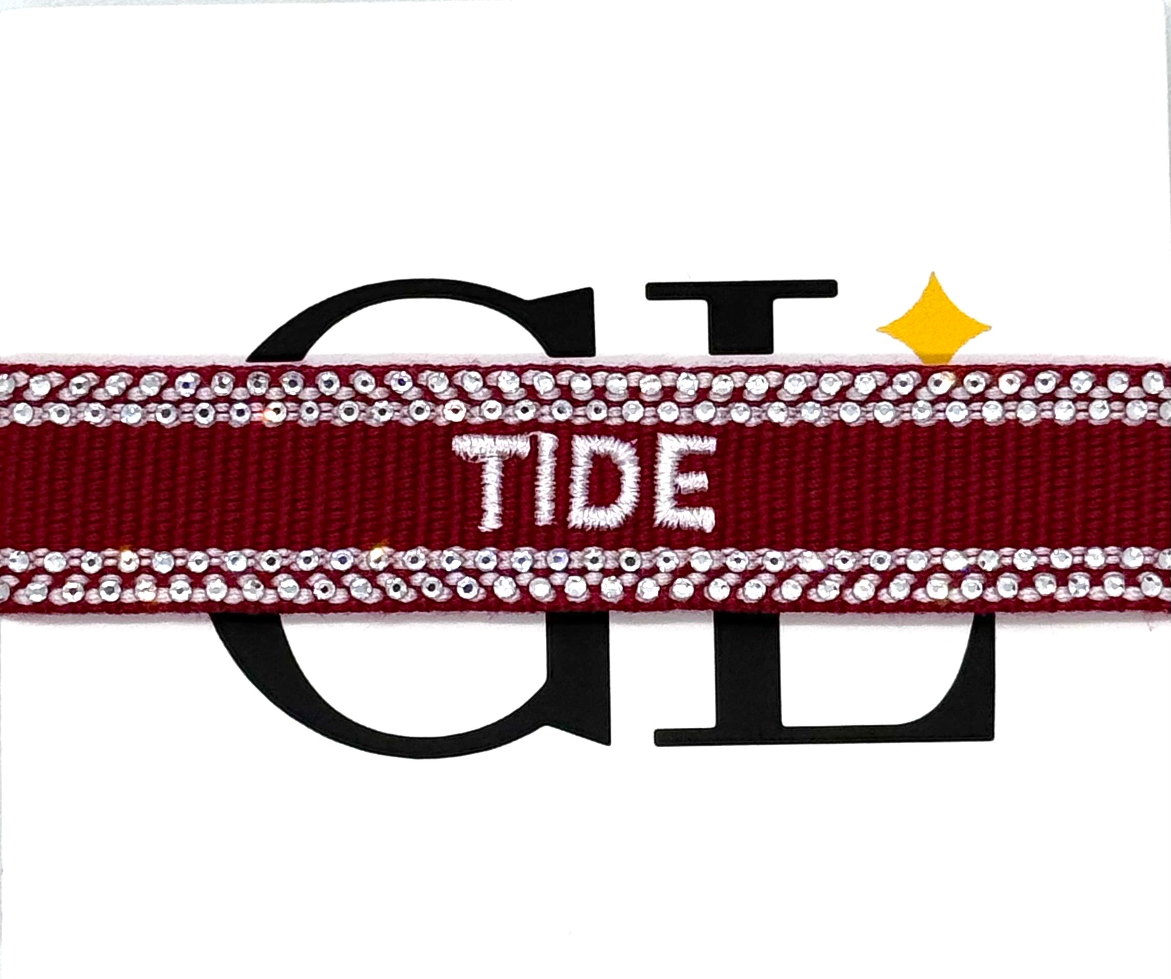 Our signature Team Tassel bracelet with a little something extra. Welcome the Tide Bling Tassel to the fam. Crimson cotton/ poly blend self tie bracelet. Tide in white font, lined with clear rhinestone edge.