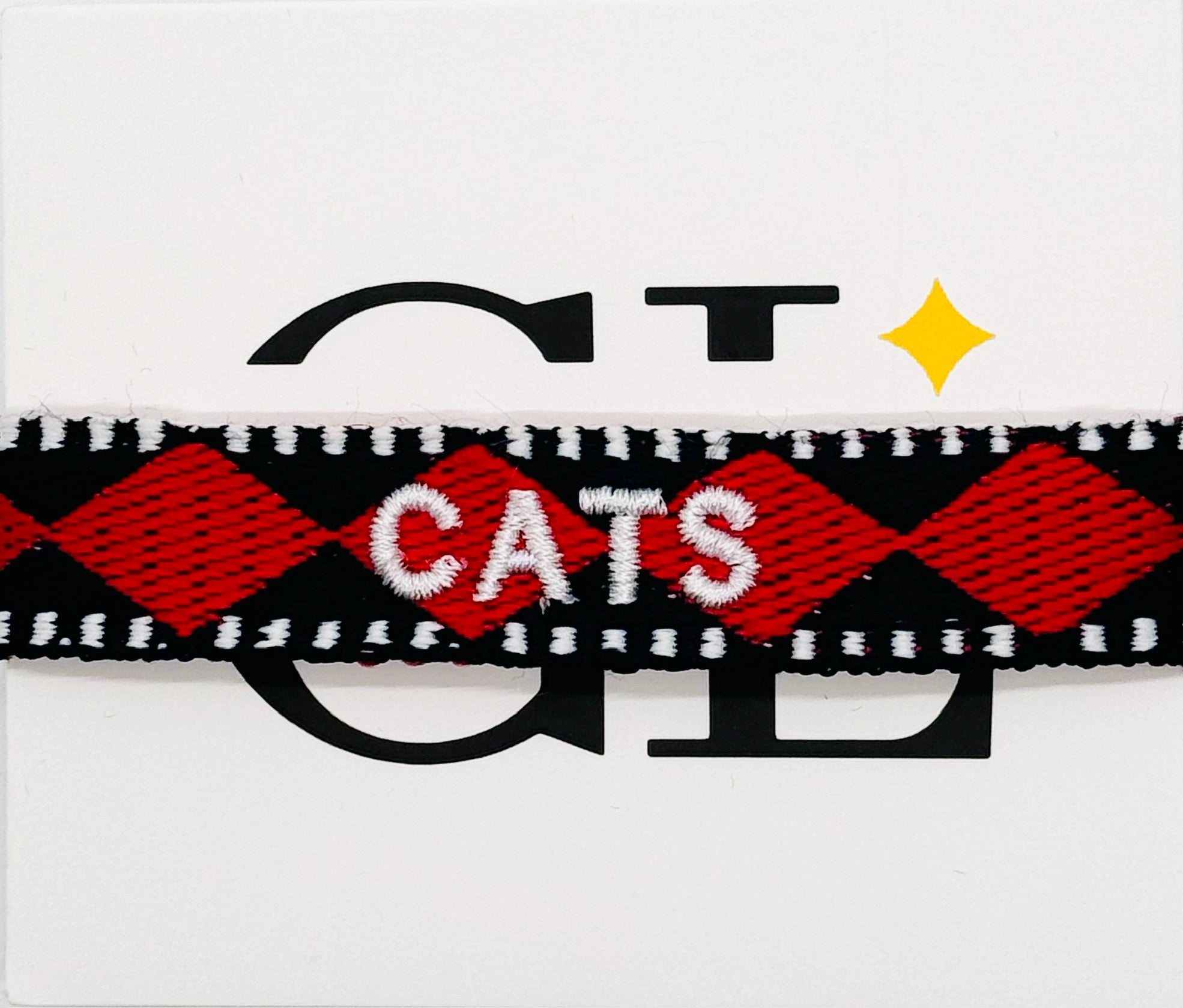 One size fits all navy and red cotton/ poly bracelet with white trim. Cats embroidered in white thread. Bracelet self ties.