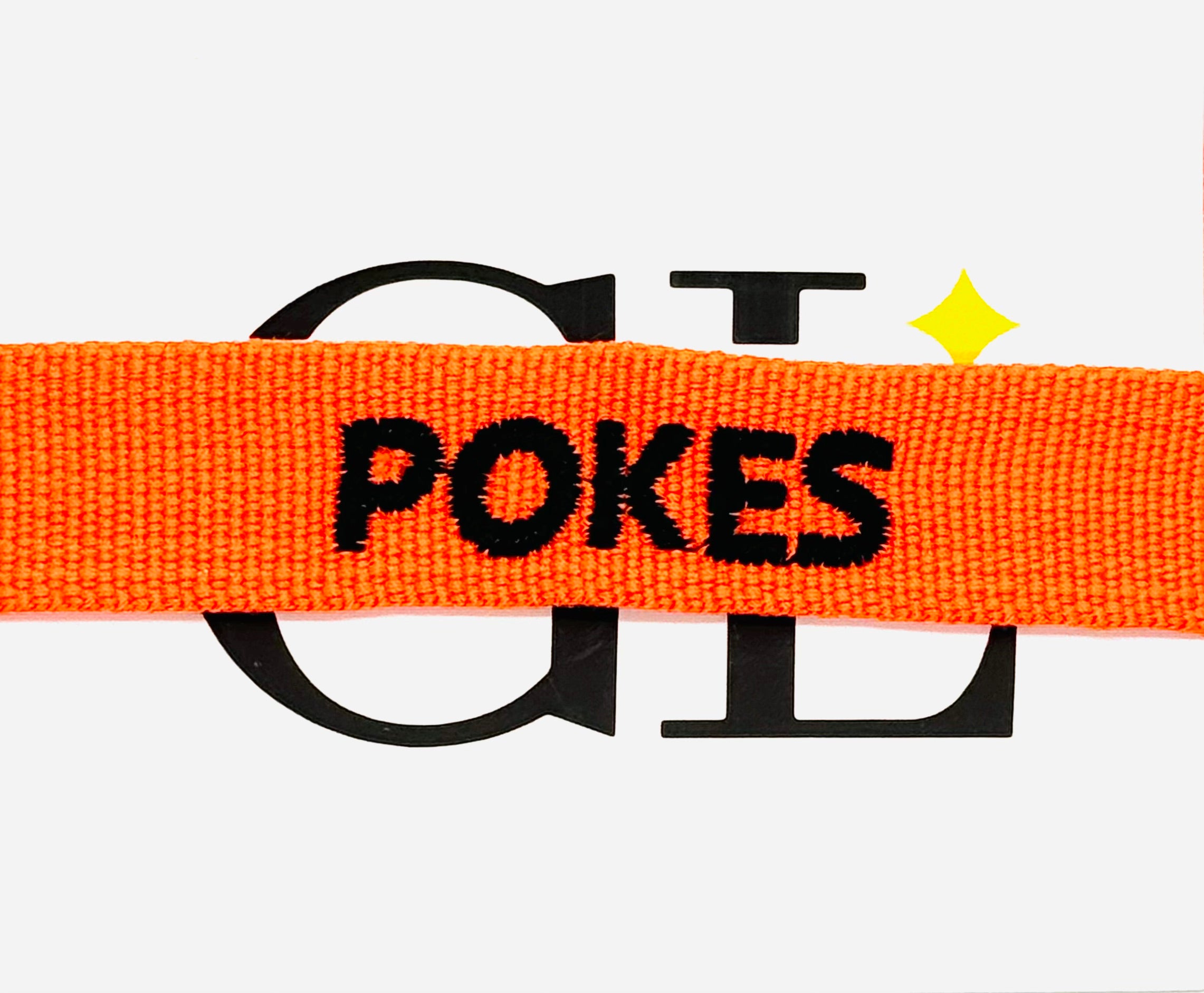 One size fits all orange cotton/ poly bracelet. Pokes embroidered in black thread. Bracelet self ties.