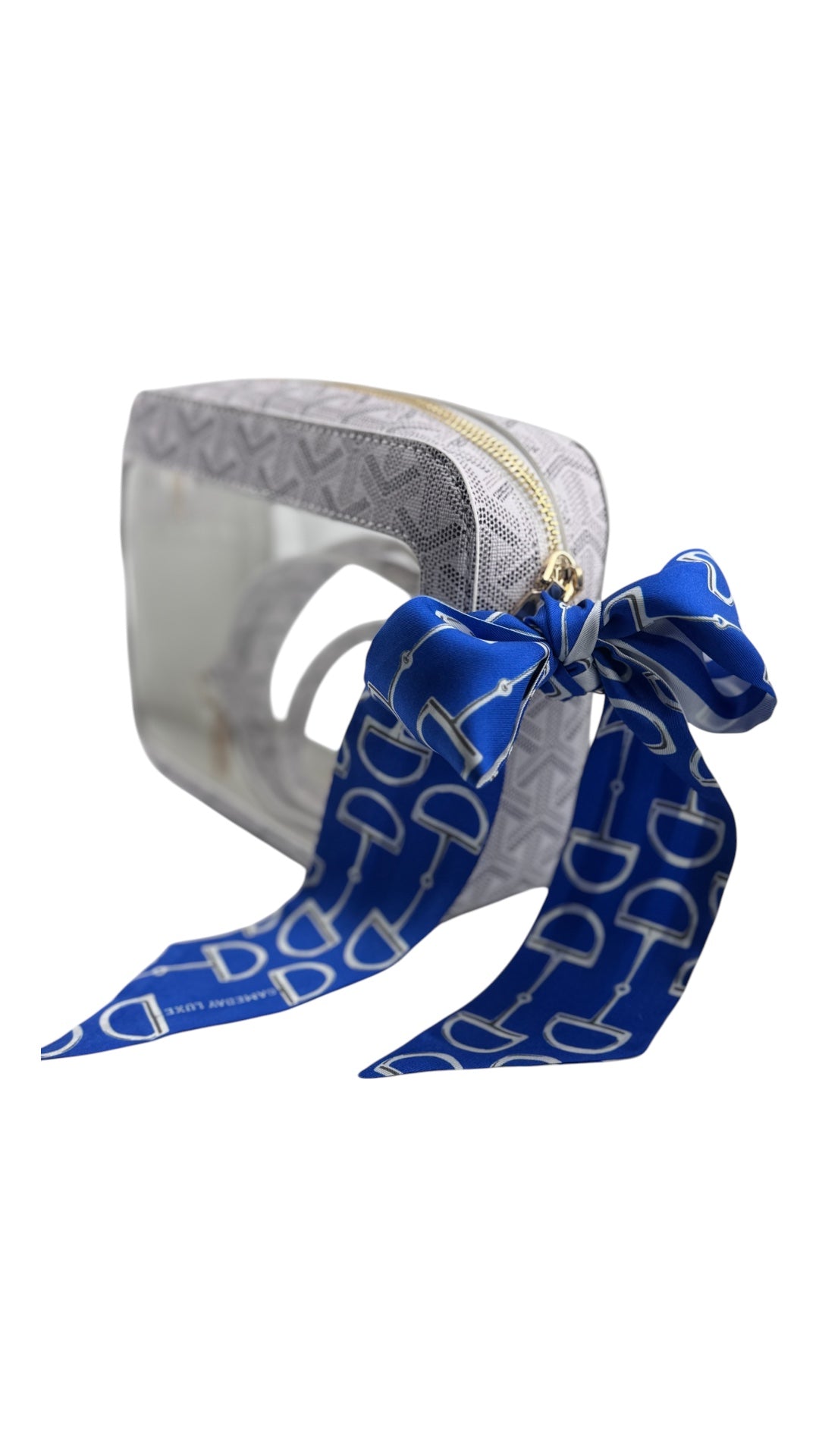 Add a little something extra to your Clear bag with one of our Signature Gameday Scarves.  Made of 100% silk, this custom fabric twilly  is sure to elevate your gameday look.  One side is printed with an iconic horsebit print while the opposite side has a complimentary classic stripe print. Tie it around the handle of your bag, wear it in your hair, or tie it onto your boots!  32 Inches x 2 Inches