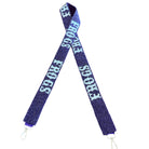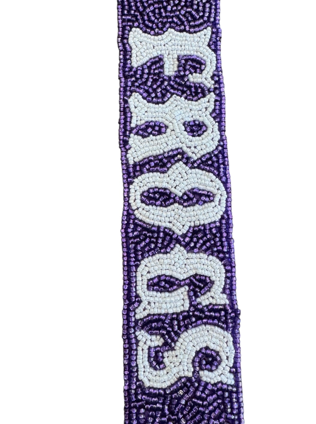 Dress up your clearbag fit with our hand beaded Frogs strap. This font style is exclusive to Gameday Luxe and features a purple glass bead in a confetti set pattern with white letters. This strap is 1.5 inches wide and 48 inches fully extended. Gold hardware.