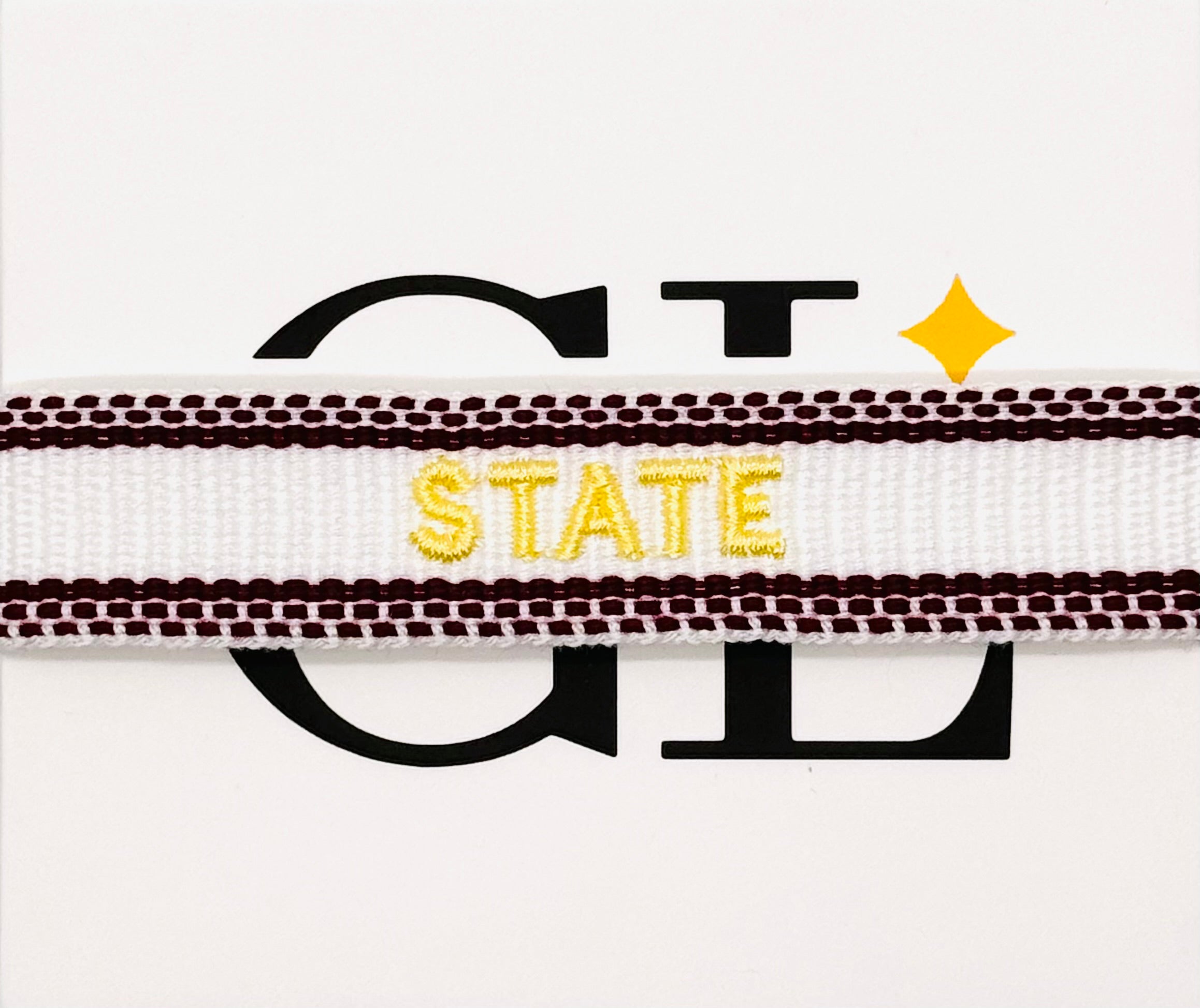 Do you love all things Florida State? Then we have a tassel for you! One size fits all deep garnet cotton/ poly bracelet with white trim. OR choose white with deep garnet trim "State" is embroidered in a vegas gold pantone. Bracelet self ties.