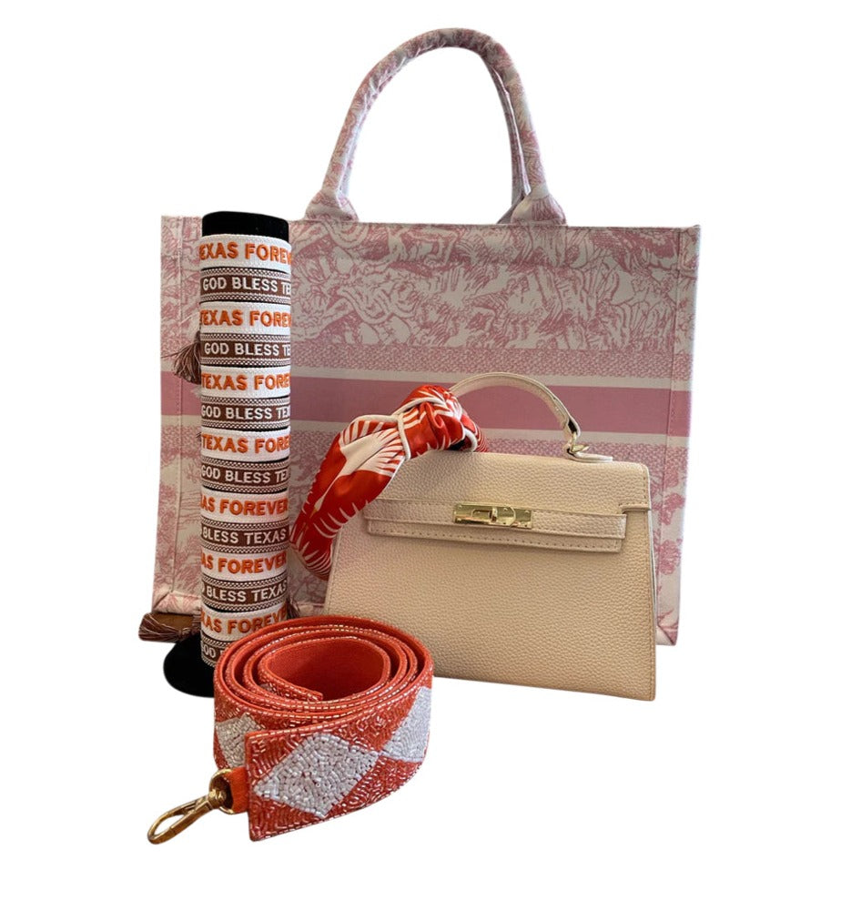 One size fits all burnt orange cotton/ poly bracelet with white trim. God Bless Texas embroidered in white thread. Bracelet self ties.