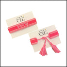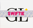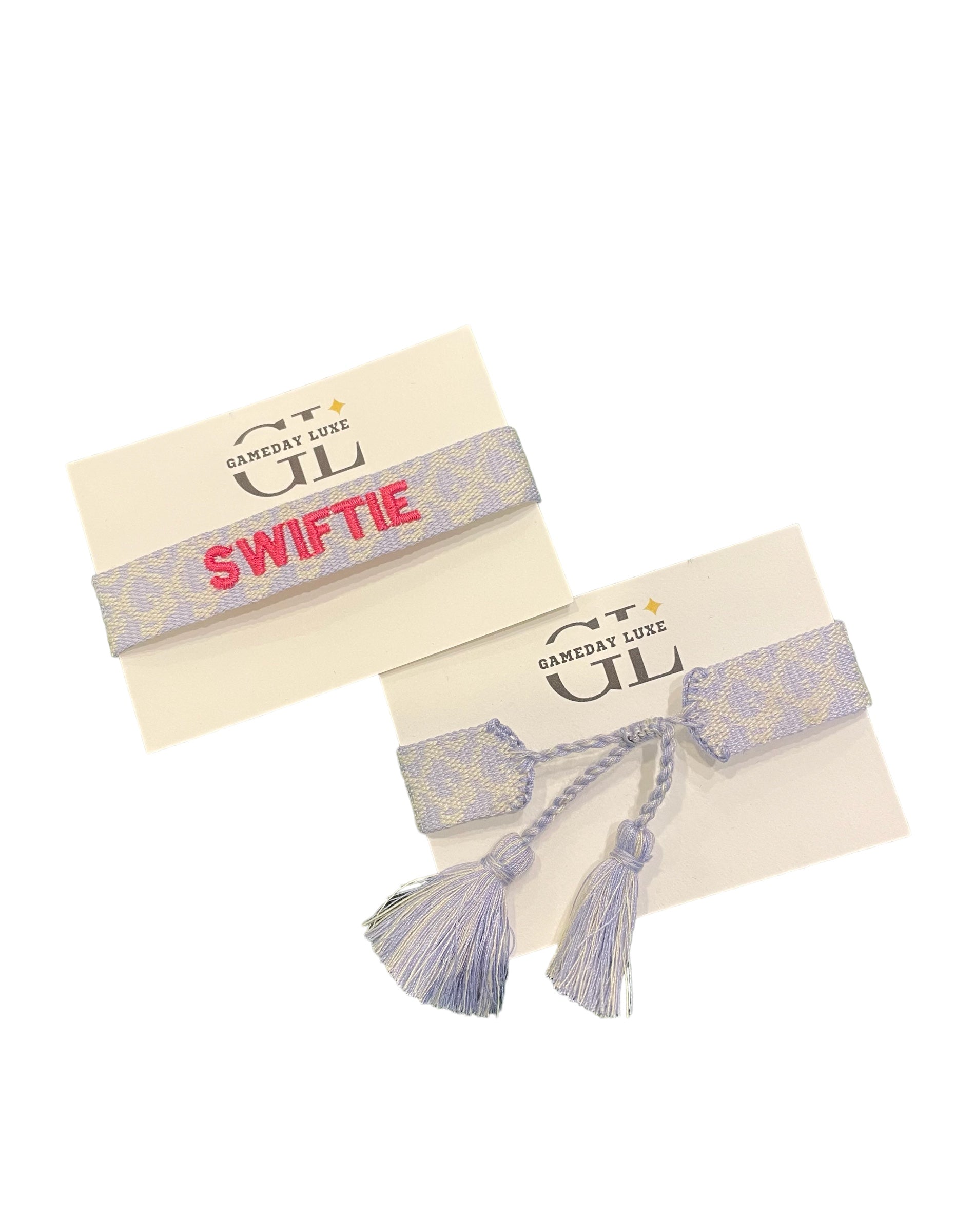 Designed for the Swiftie in our life, this self tie tassel bracelet is one size fits all. Bracelet is available in Lilac and white print with hot pink embroidered “swiftie” or pink with lavender embroidered “swiftie”