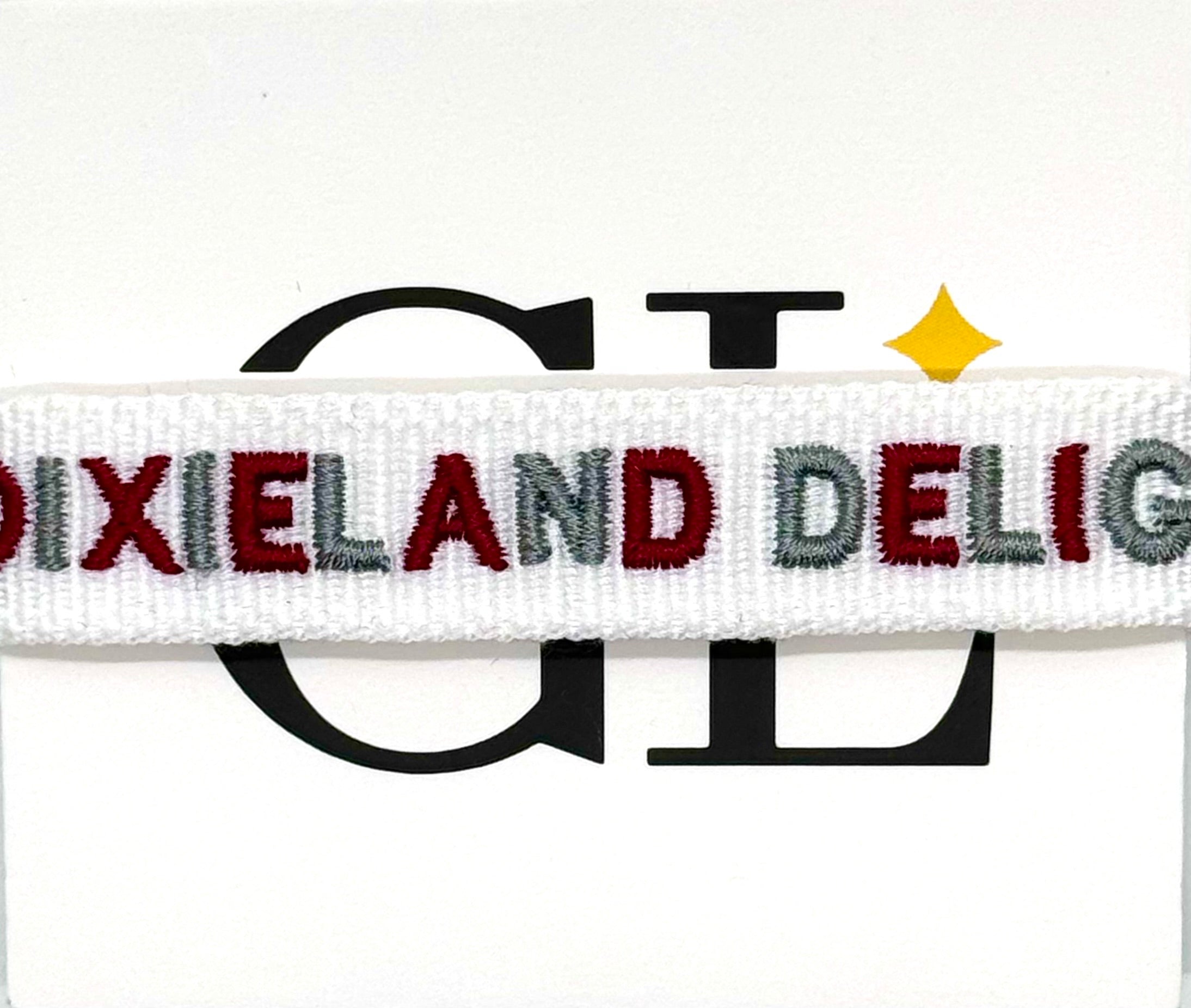 One size fits all white cotton/ poly bracelet with DIXIELAND DELIGHT in alternating red and grey font. Bracelet self ties.