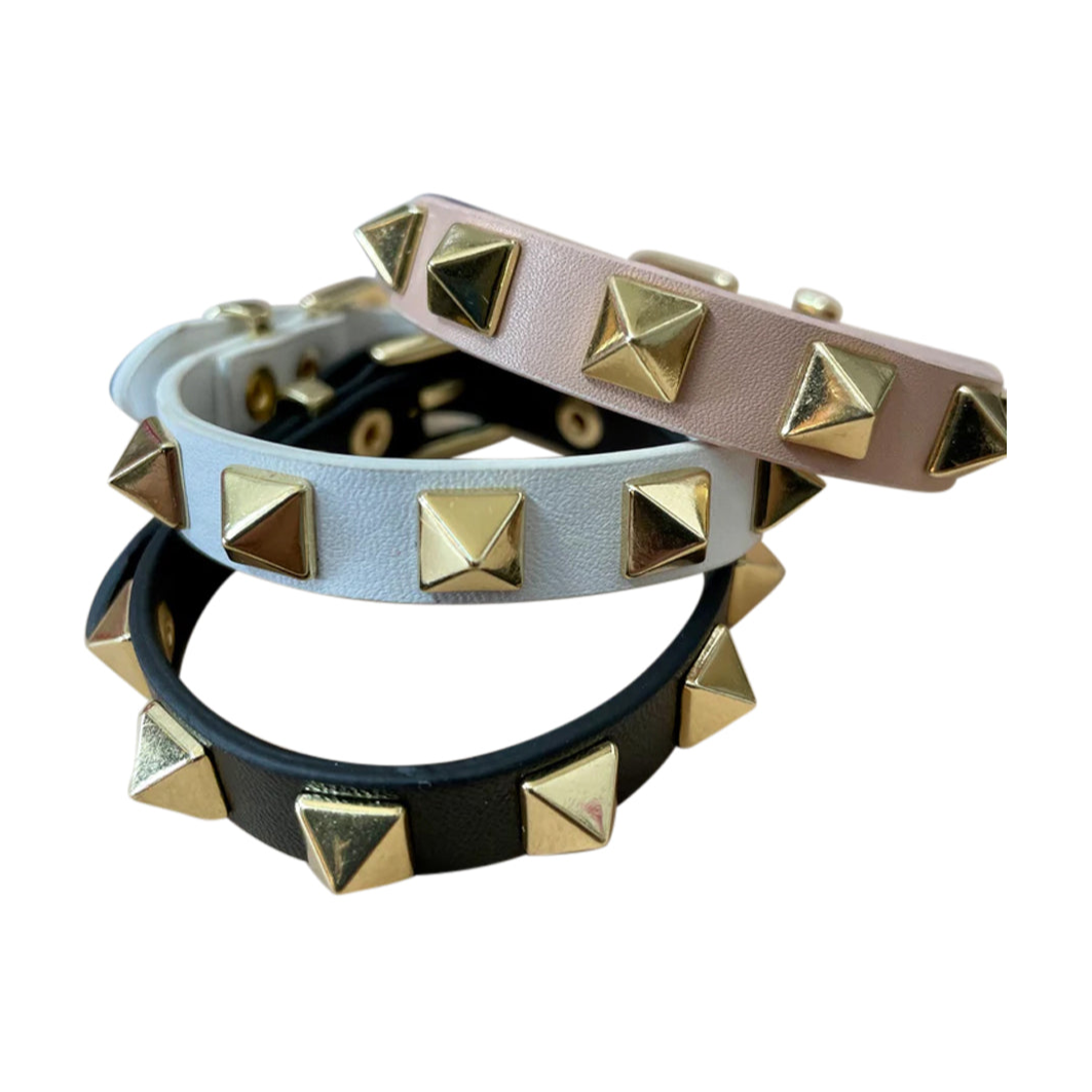 The perfect stacking piece. Adjustable leather band fits wrists 7-9 inches. Gold plated pyramid rivet stud