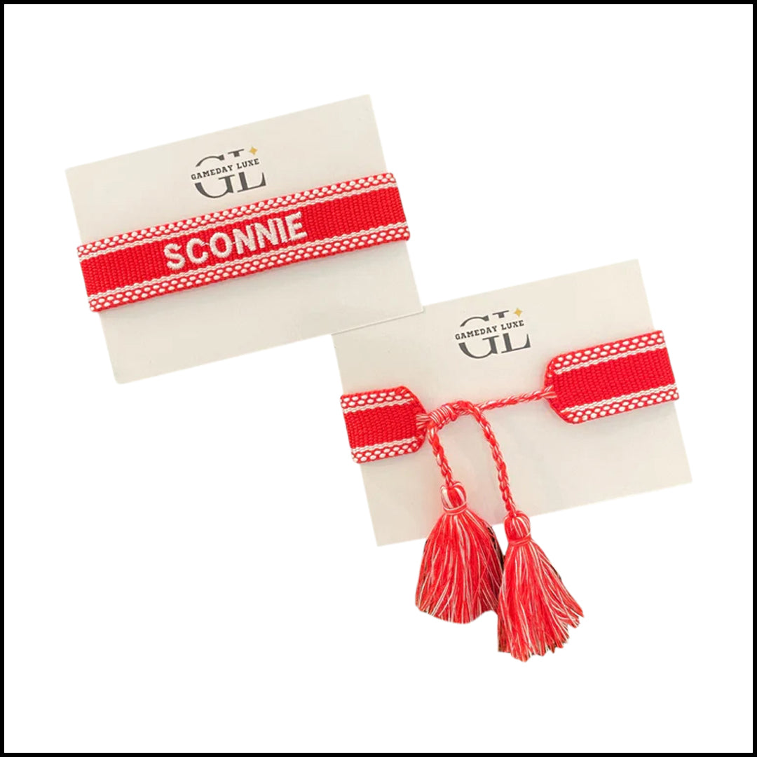 Love a fishbowl at Wando's? Spend Sunday mornings at Mickey's?.....Then this Tassel is for you!!!  One size fits all red cotton / poly bracelet with white trim. Sconnie embroidered in white trim. Bracelet self ties.