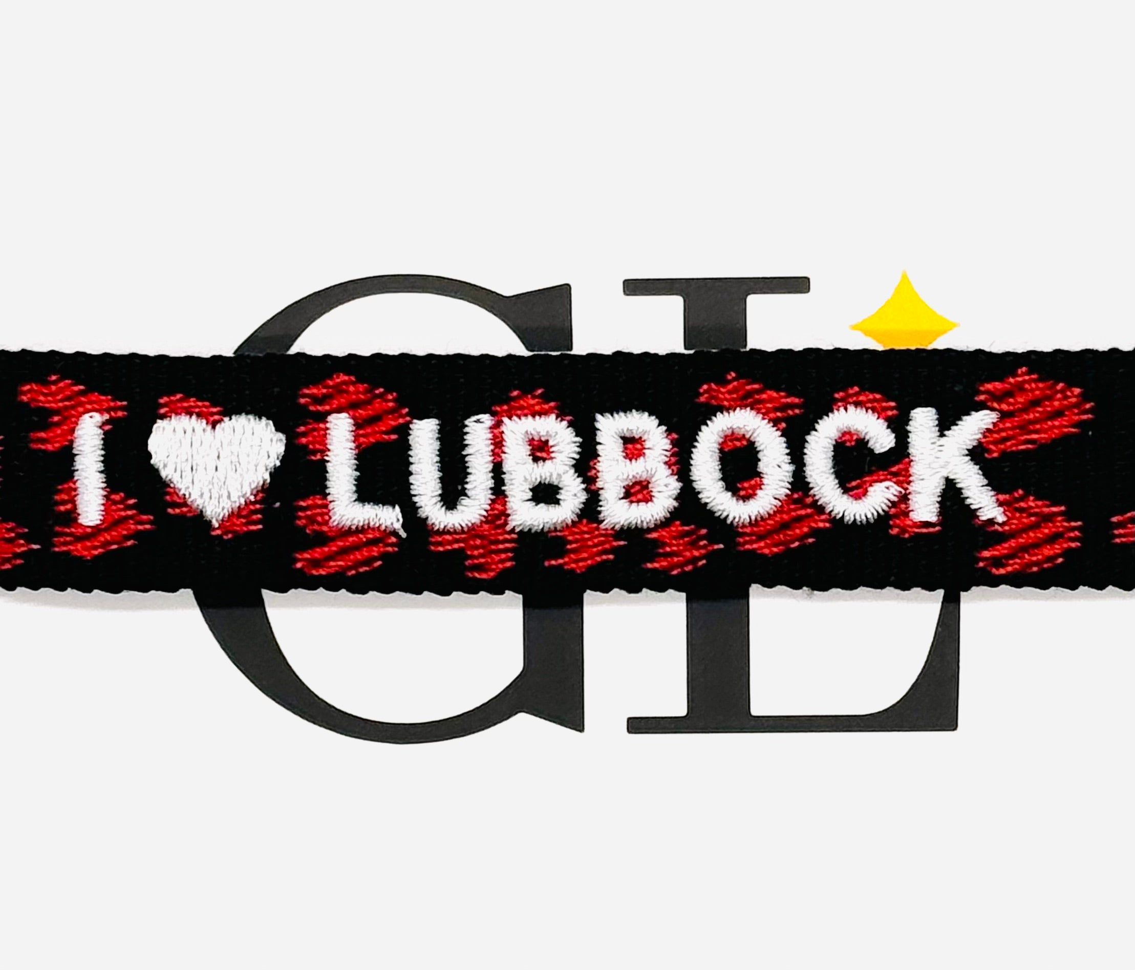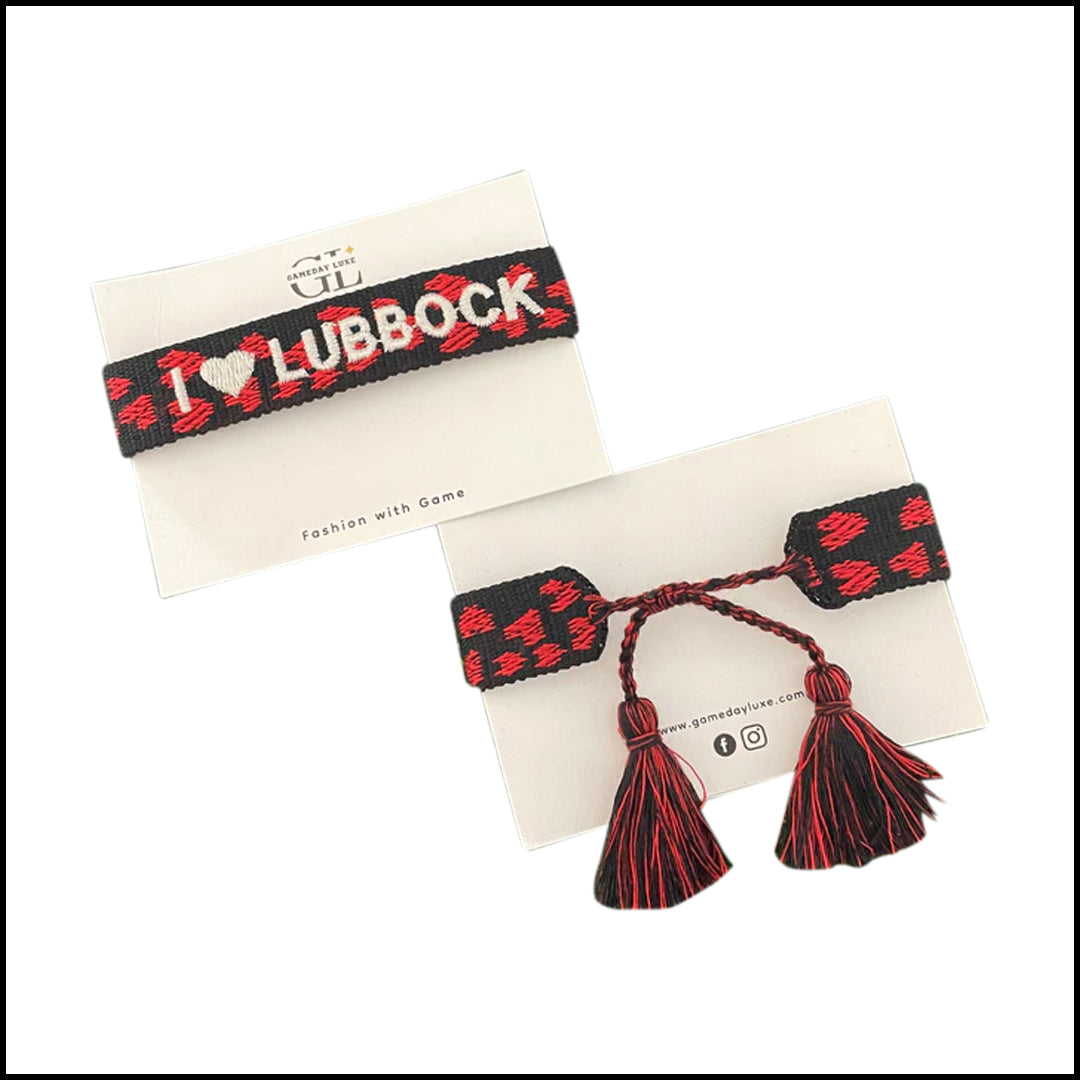 Show your love for Texas Tech with the I ❤️ Lubbock team tassel. One size fits all. Red and black print with white embroidery. Self tie. Cotton/ poly blend.