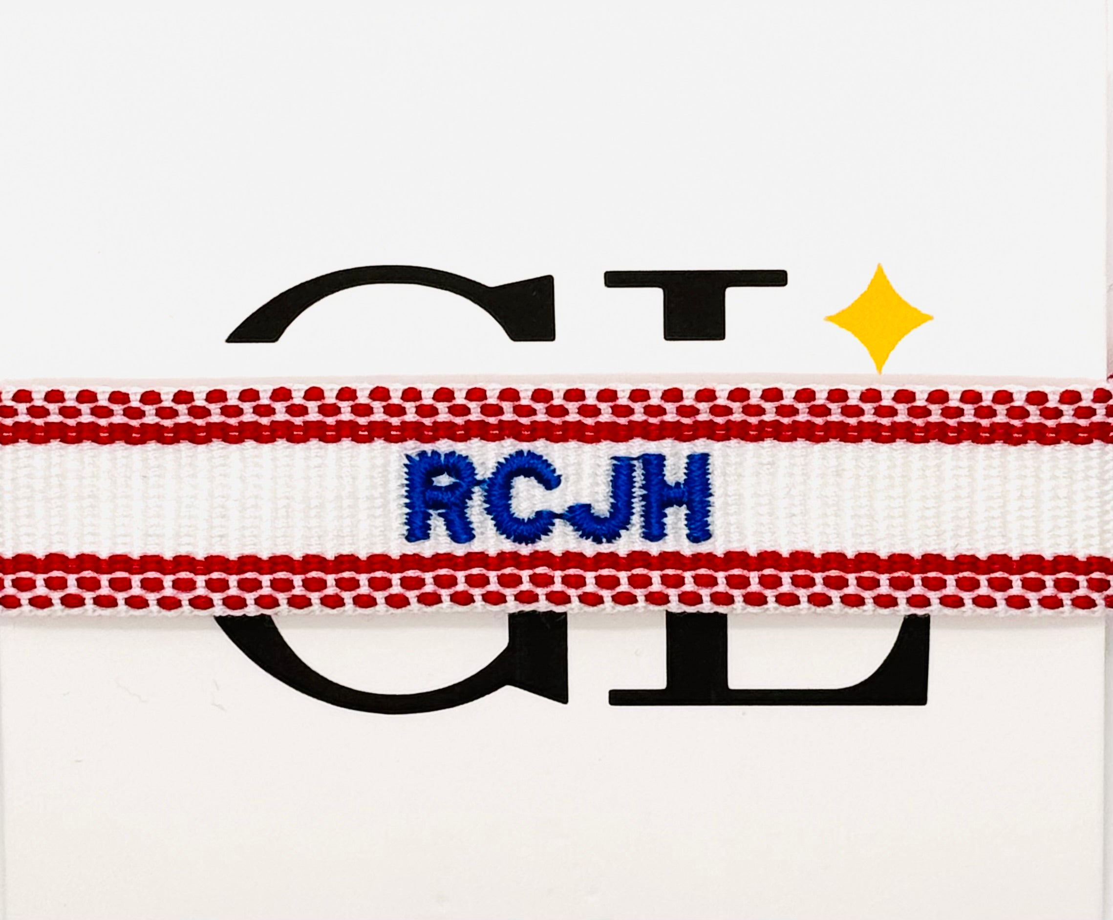 One size fits all white cotton / poly bracelet with red trim. RCJH embroidered in blue embroidery. Bracelet self ties.