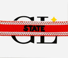 Our signature Team Tassel bracelet with a little something extra.  Welcome the State Bling Tassel to the fam.  Orange cotton/ poly blend self tie bracelet. State in black font, lined with clear rhinestone edge.