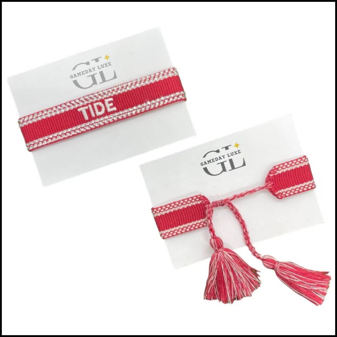Our signature Team Tassel bracelet with a little something extra. Welcome the Tide Bling Tassel to the fam. Crimson cotton/ poly blend self tie bracelet. Tide in white font, lined with clear rhinestone edge.